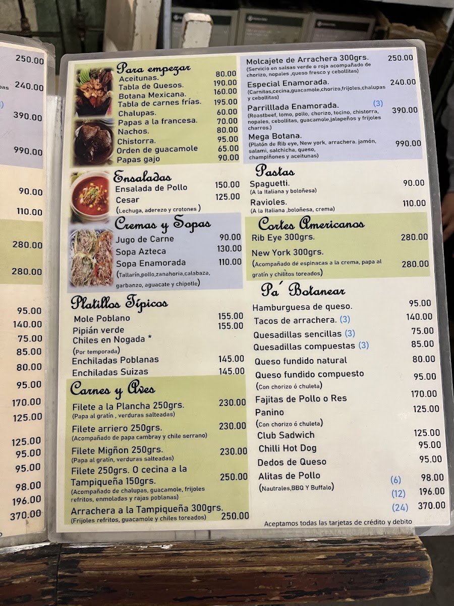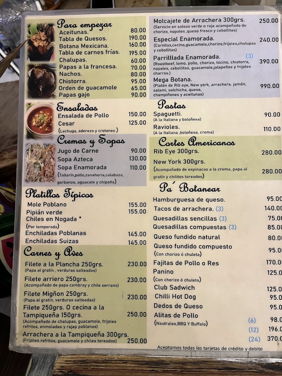 This menu supports different dining scenarios, from quick orders of snacks and drinks to more leisurely meals featuring traditional Mexican dishes and grilled items.