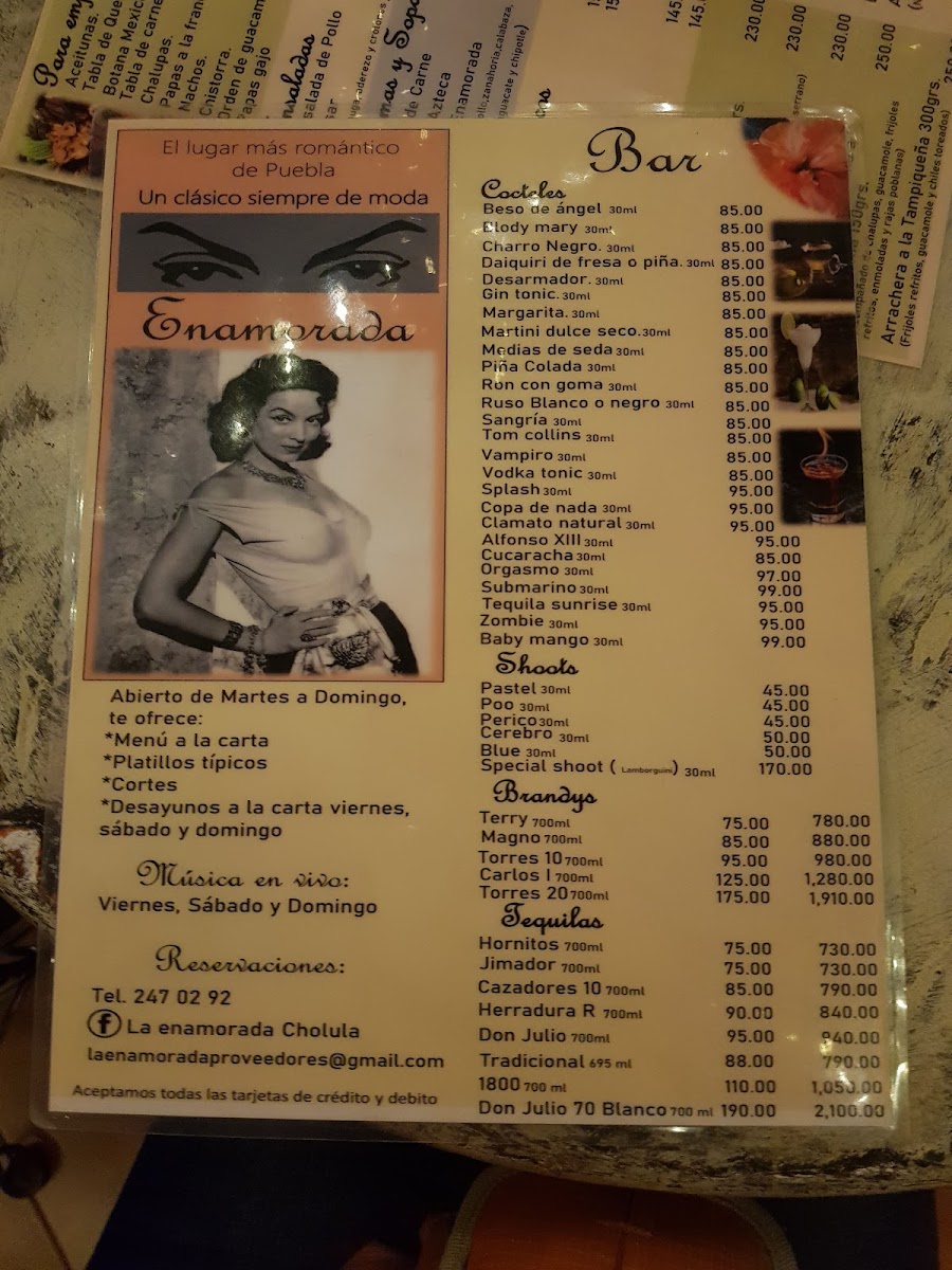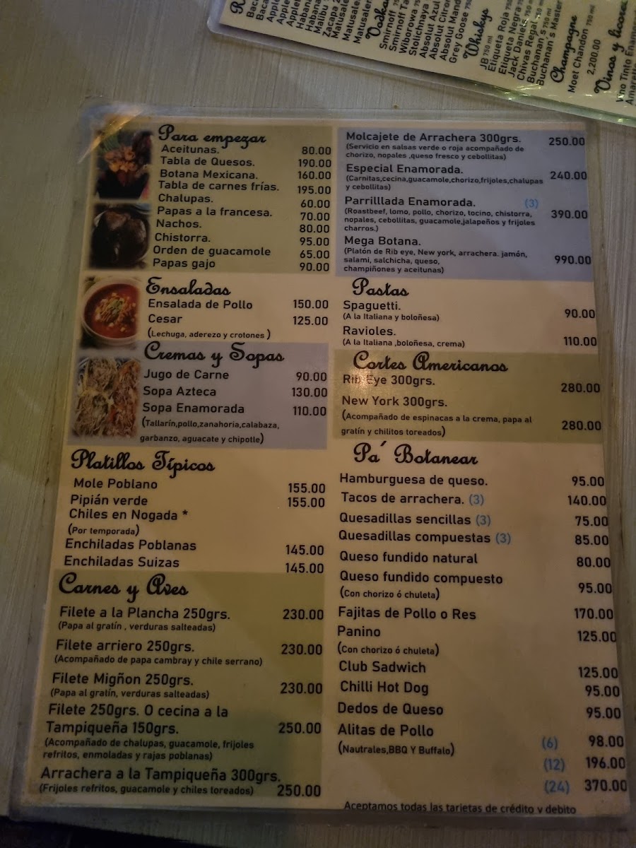 The menu offers a variety of traditional Mexican dishes along with bar and grill options, suitable for different meal occasions including breakfast, lunch, and casual dining. Guests can find a selection of appetizers, main courses, salads, pizzas, and beverages.