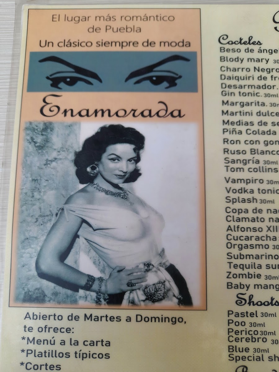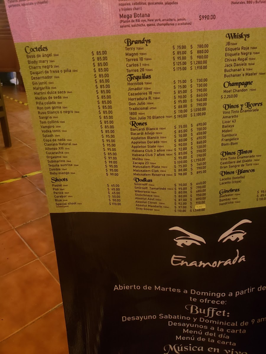 The beverage selection encompasses cocktails like Margarita Limón and Tequila Sunrise, local beers including Cerveza Ultra, and a limited wine list featuring options such as Vino Tinto Enamorada. These offerings are suitable for accompanying meals or enjoying drinks at the bar.
